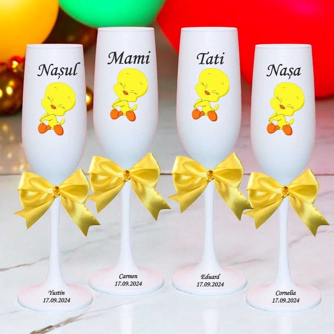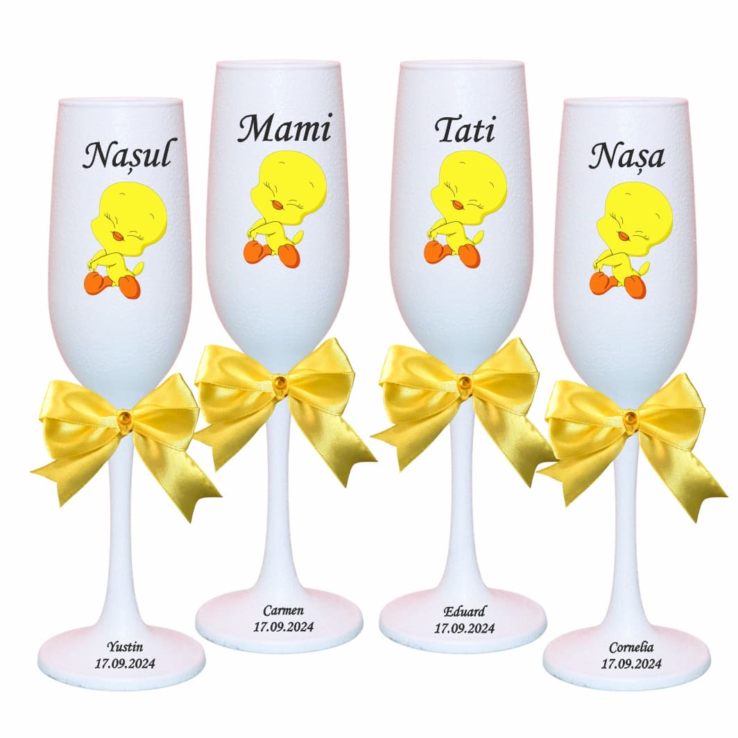 Acest set de pahare personalizate de botez este perfect pentru părinți, nași și invitați care își doresc un accesoriu elegant și tematic pentru masa de sărbătoare. Designul adorabil cu Tweety adaugă un aer jucaus, transformând fiecare moment într-o amintire de neuitat. Fiecare pahar este finisat manual cu grijă, iar printul UV garantează o imagine clară, detaliată și permanentă.