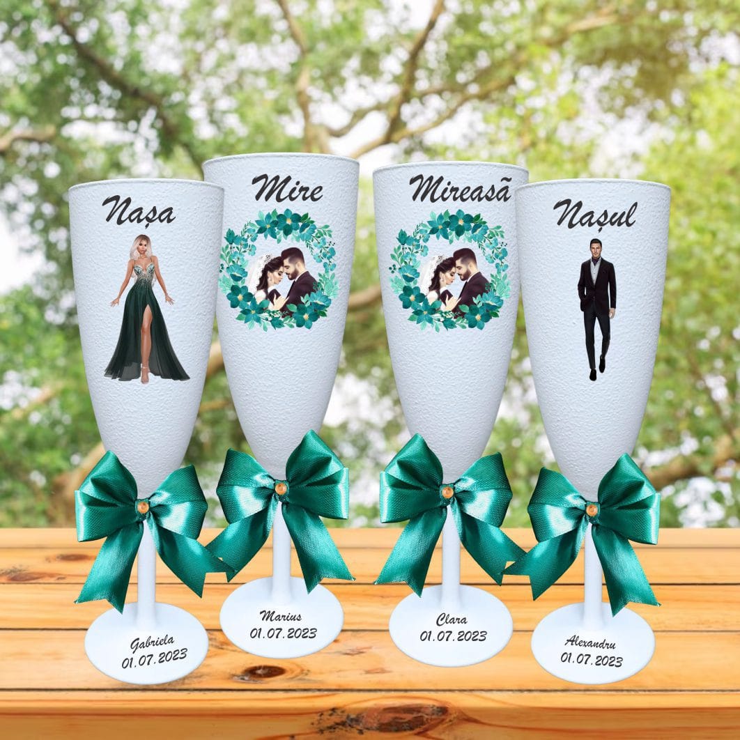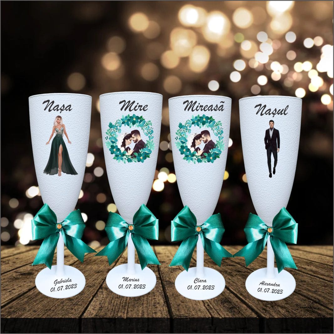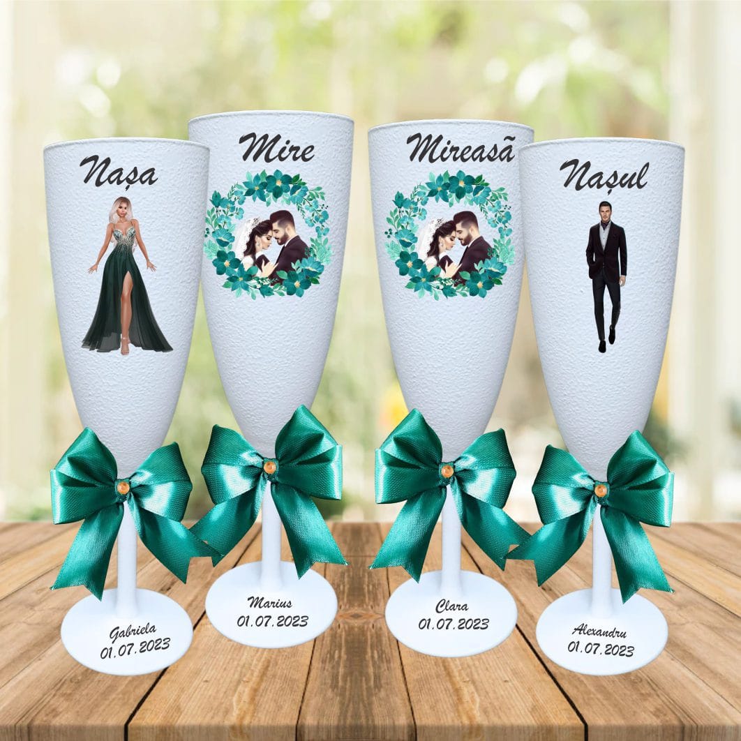 Setul este alcatuit din 4 pahare de sampanie albe, decorate cu siluete si personalizate cu numele mirilor/ nasilor si data evenimentului.