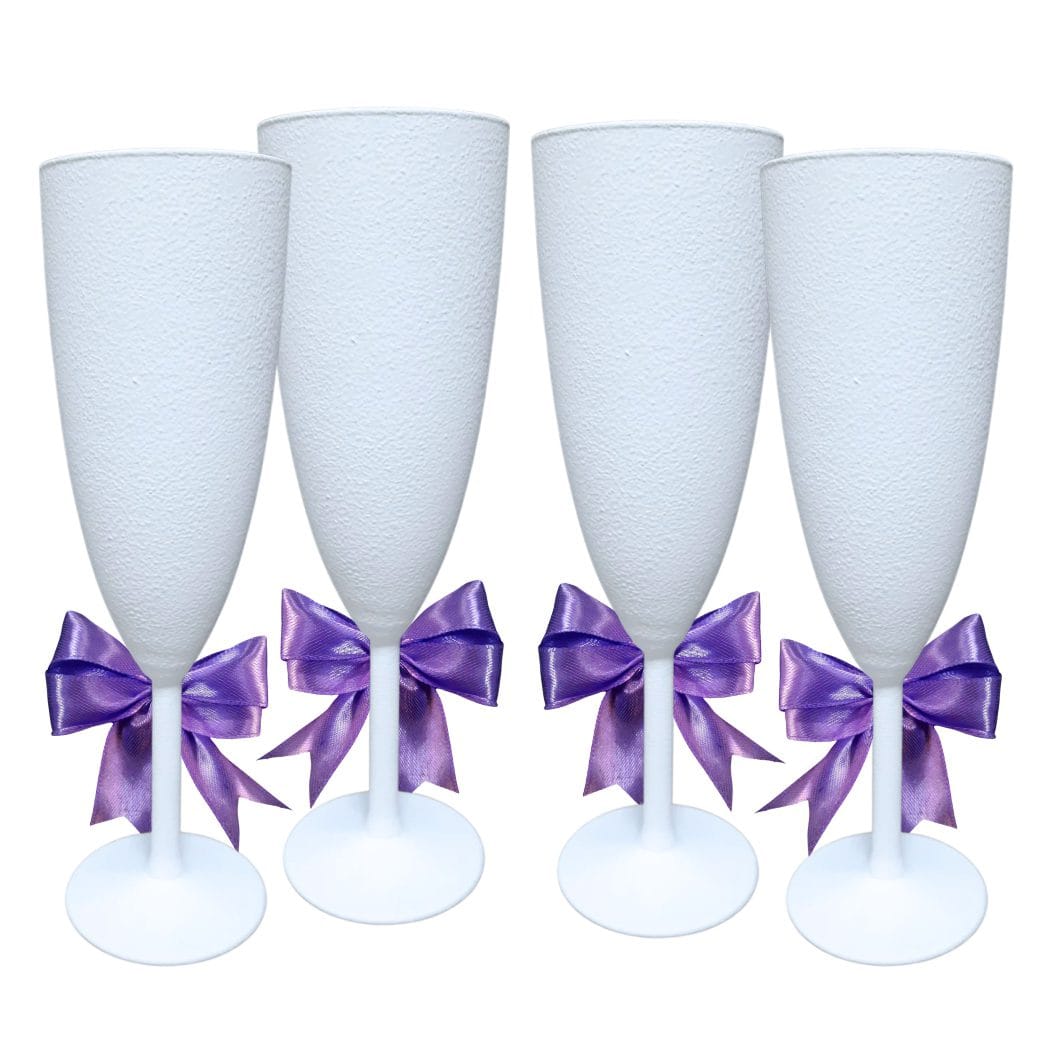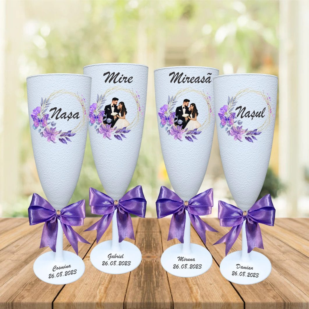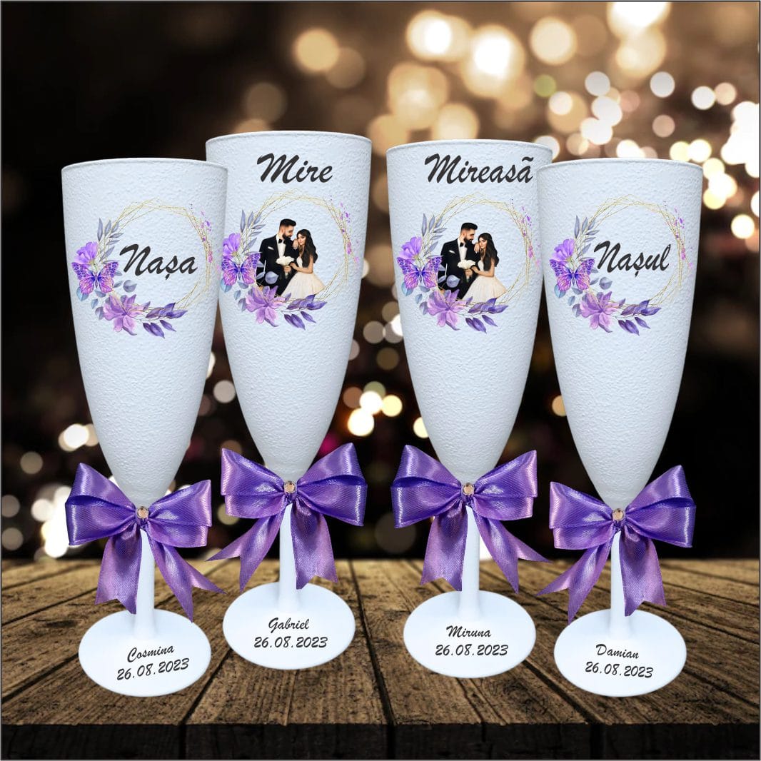 Setul este alcatuit din 4 pahare de sampanie albe, decorate cu siluete si personalizate cu numele mirilor/ nasilor si data evenimentului.