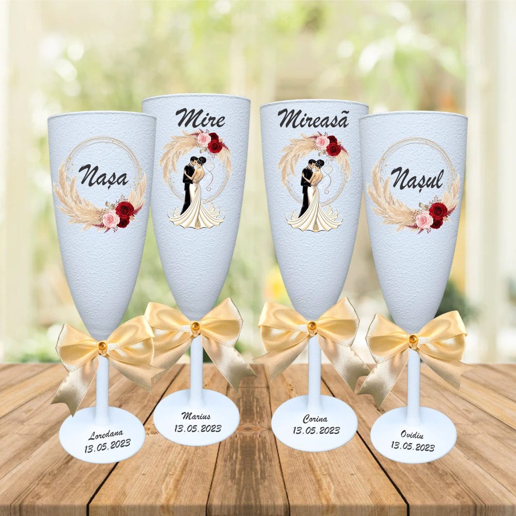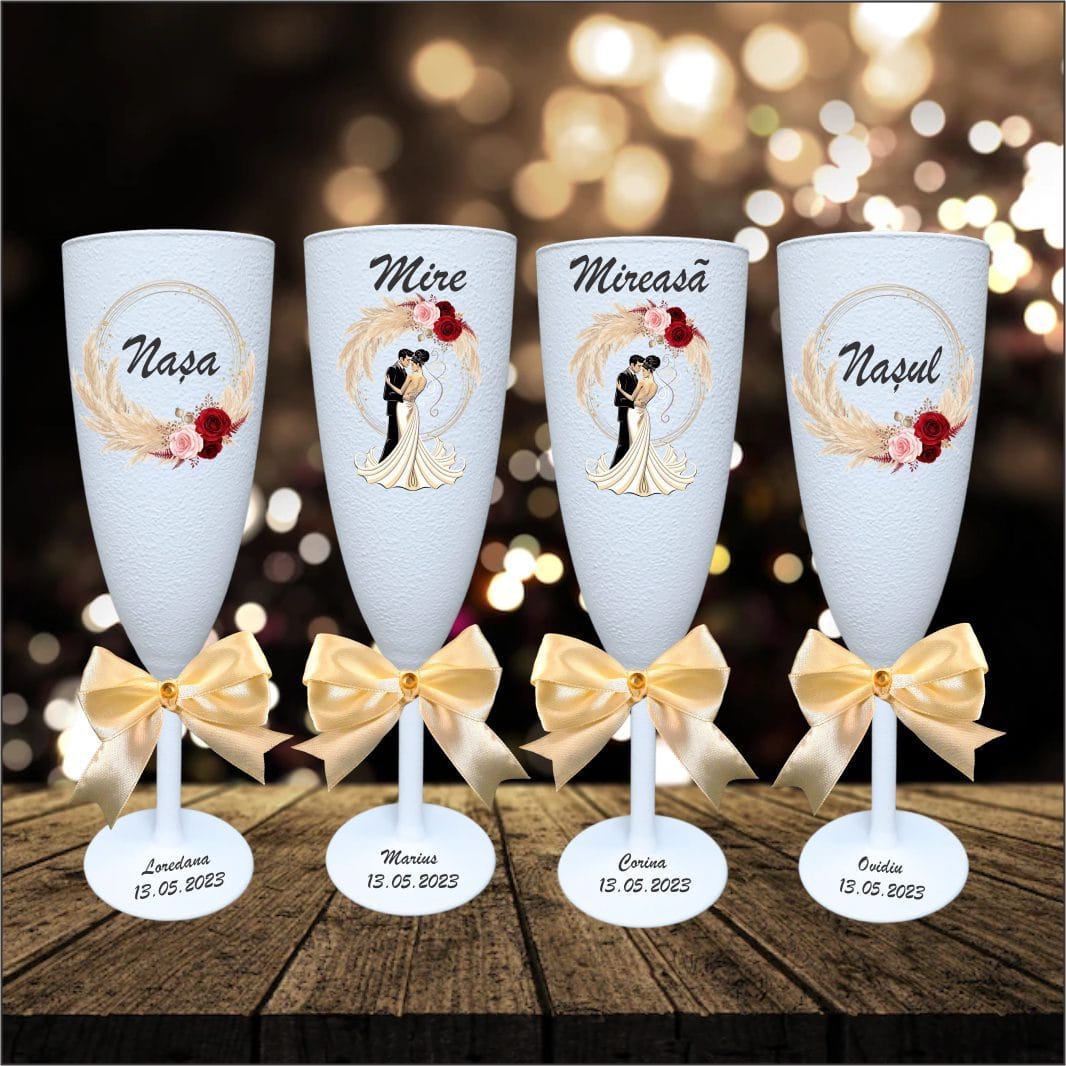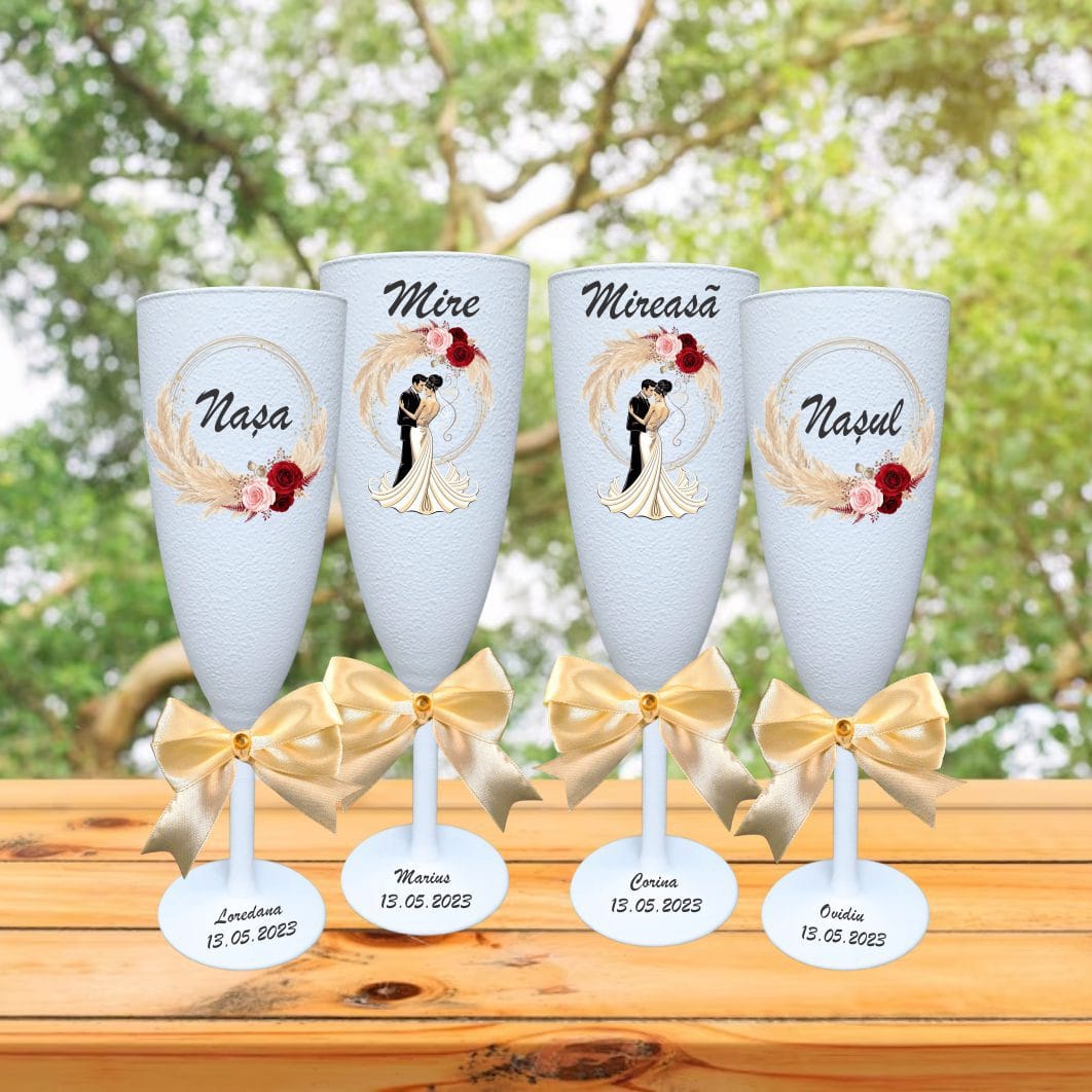Setul este alcatuit din 4 pahare de sampanie albe, decorate cu siluete si personalizate cu numele mirilor/ nasilor si data evenimentului.