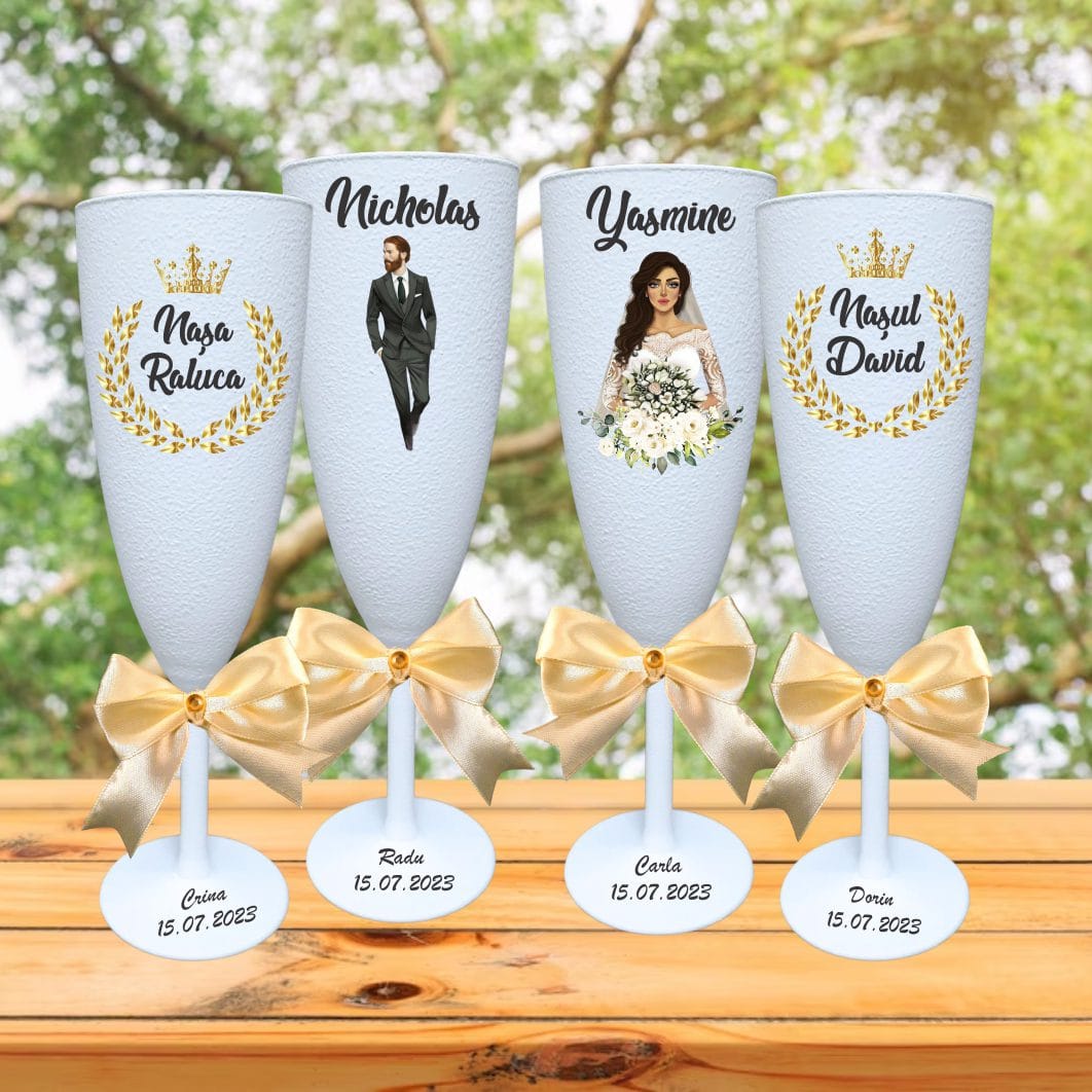 Setul este alcatuit din 4 pahare de sampanie albe, decorate cu siluete si personalizate cu numele mirilor/ nasilor si data evenimentului.