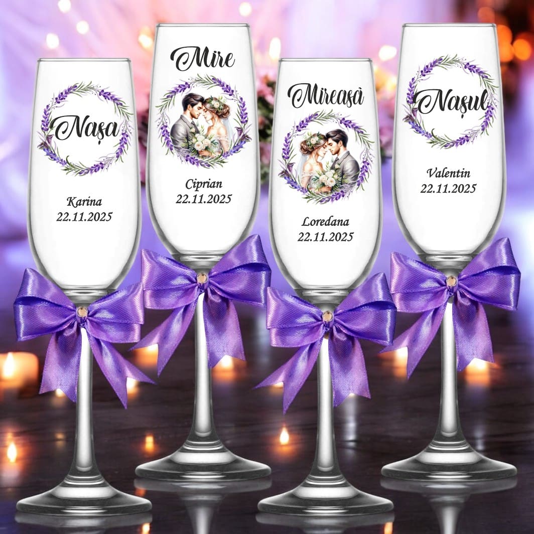 Set 4 Pahare Personalizate, Nunta, Miri, Nasi, Mov, PNBT013