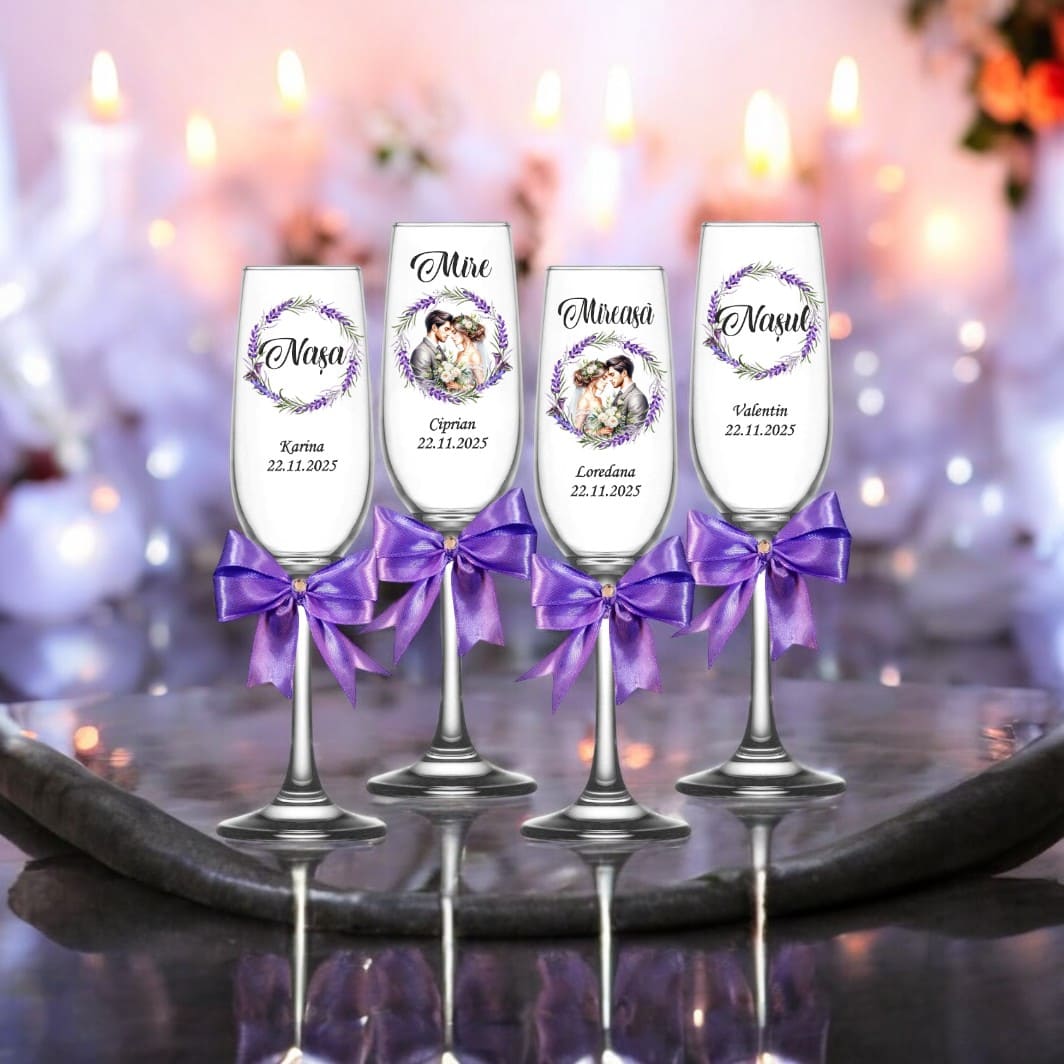 Realizate din sticlă transparentă de calitate superioară, fiecare pahar este personalizat cu numele mirilor, al nașilor și data evenimentului, adăugând o notă unică și emoționantă fiecărei petreceri.