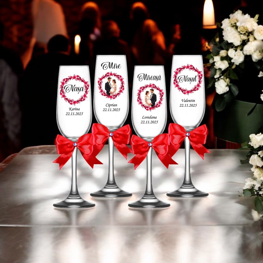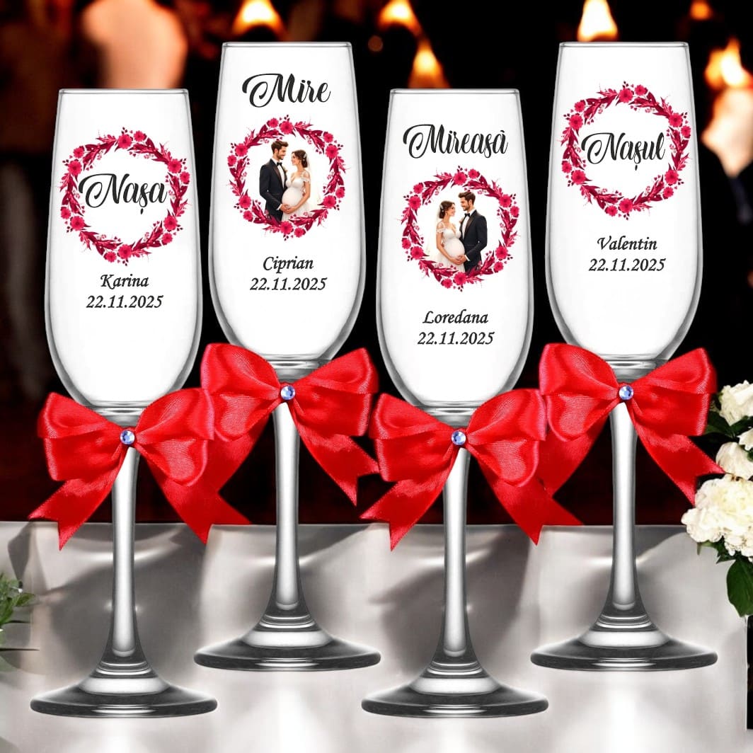Transformă momentul toastului într-o amintire de neuitat cu acest set exclusiv de 4 pahare de șampanie, special create pentru miri și nași.