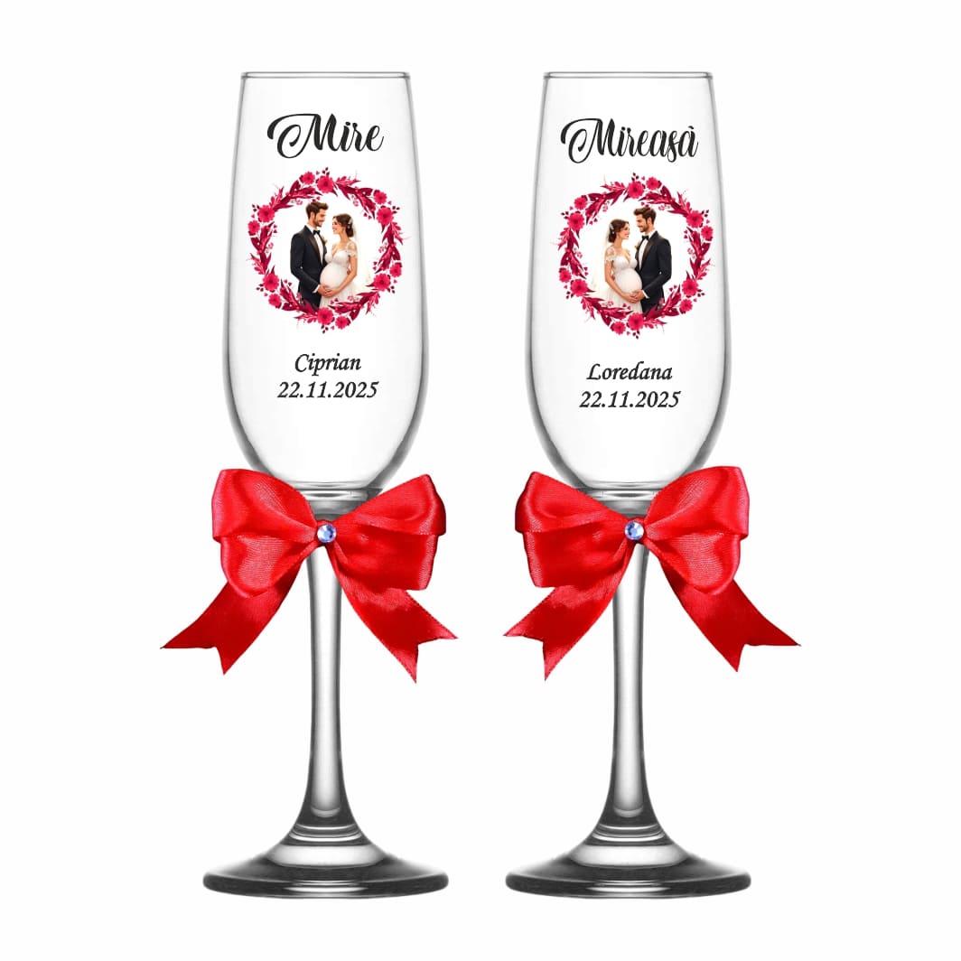 Realizate din sticlă transparentă de calitate superioară, fiecare pahar este personalizat cu numele mirilor, al nașilor și data evenimentului, adăugând o notă unică și emoționantă fiecărei petreceri.