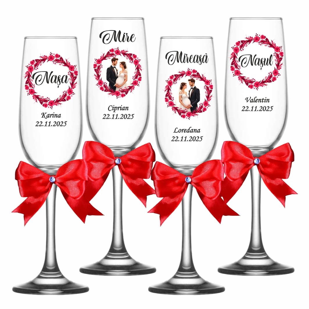Set 4 Pahare Personalizate, Nunta, Miri, Nasi, Rosu, PNBT019