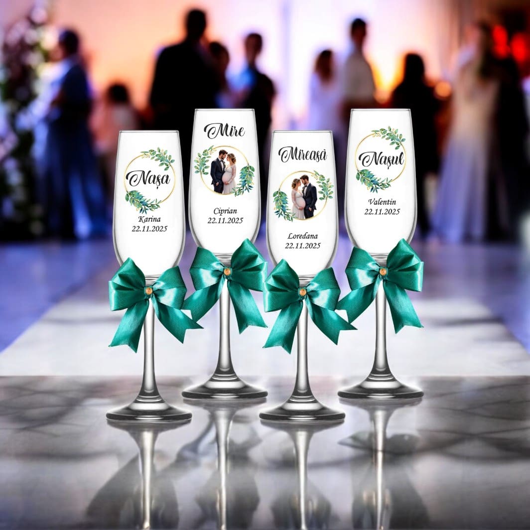 Transformă momentul toastului într-o amintire de neuitat cu acest set exclusiv de 4 pahare de șampanie, special create pentru miri și nași.