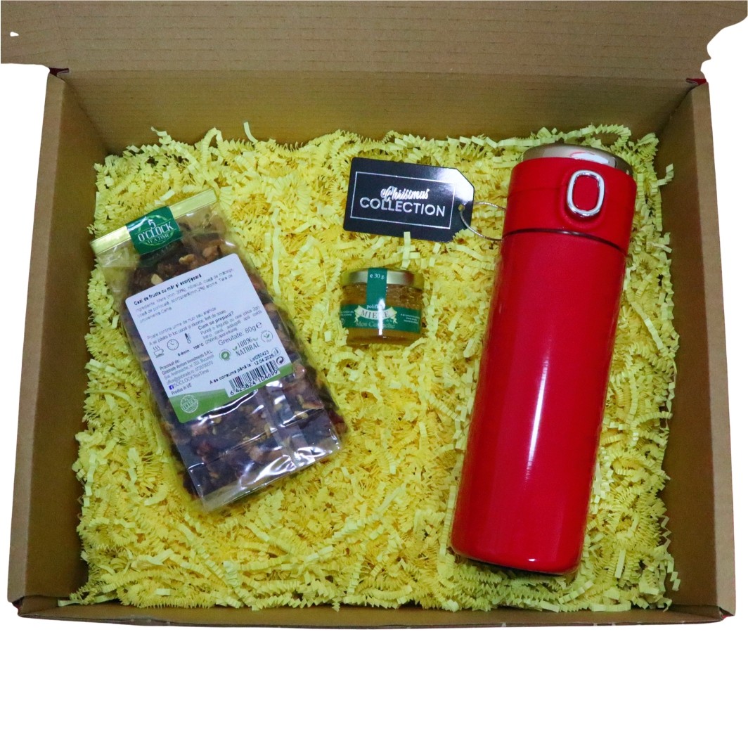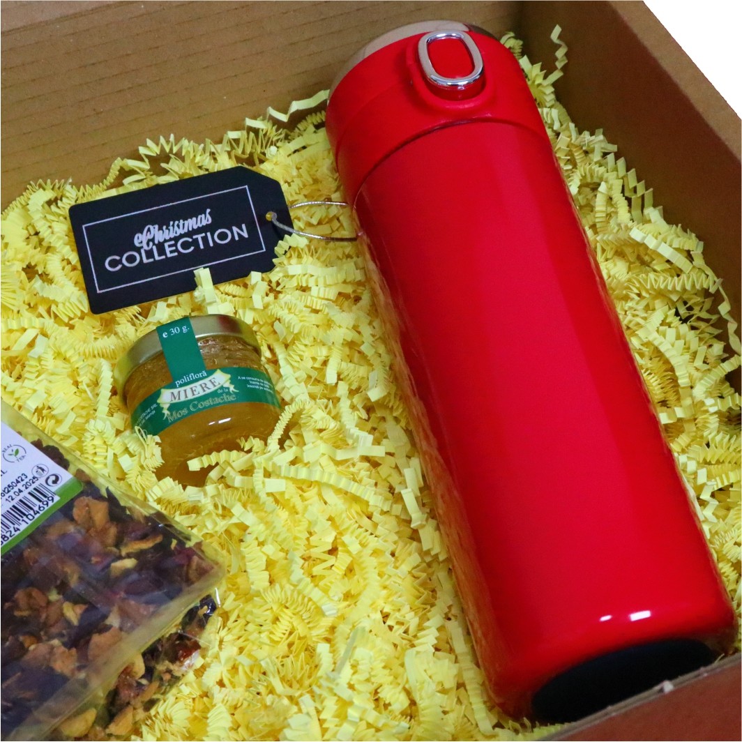 Set cadou Craciun 3 piese, Ceai, Termos rosu smart, Miere, 32,5×25,5×10,5 cm, SCC014