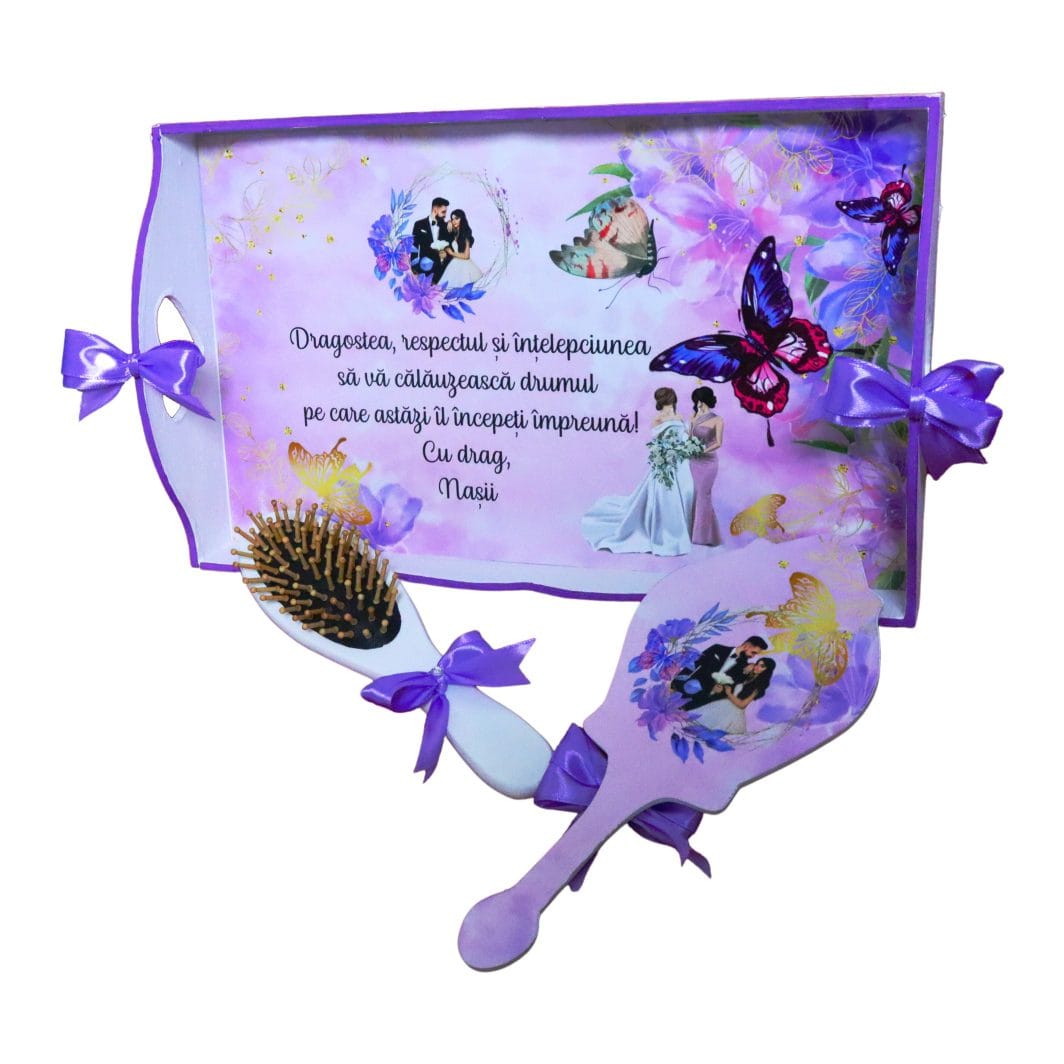 Setul pentru gătitul miresei cuprinde tăvița, peria de par și oglinda ce îți va tranforma nunta într-o poveste cu prinți și prințese și vor da startul unei vieți minunate în doi.