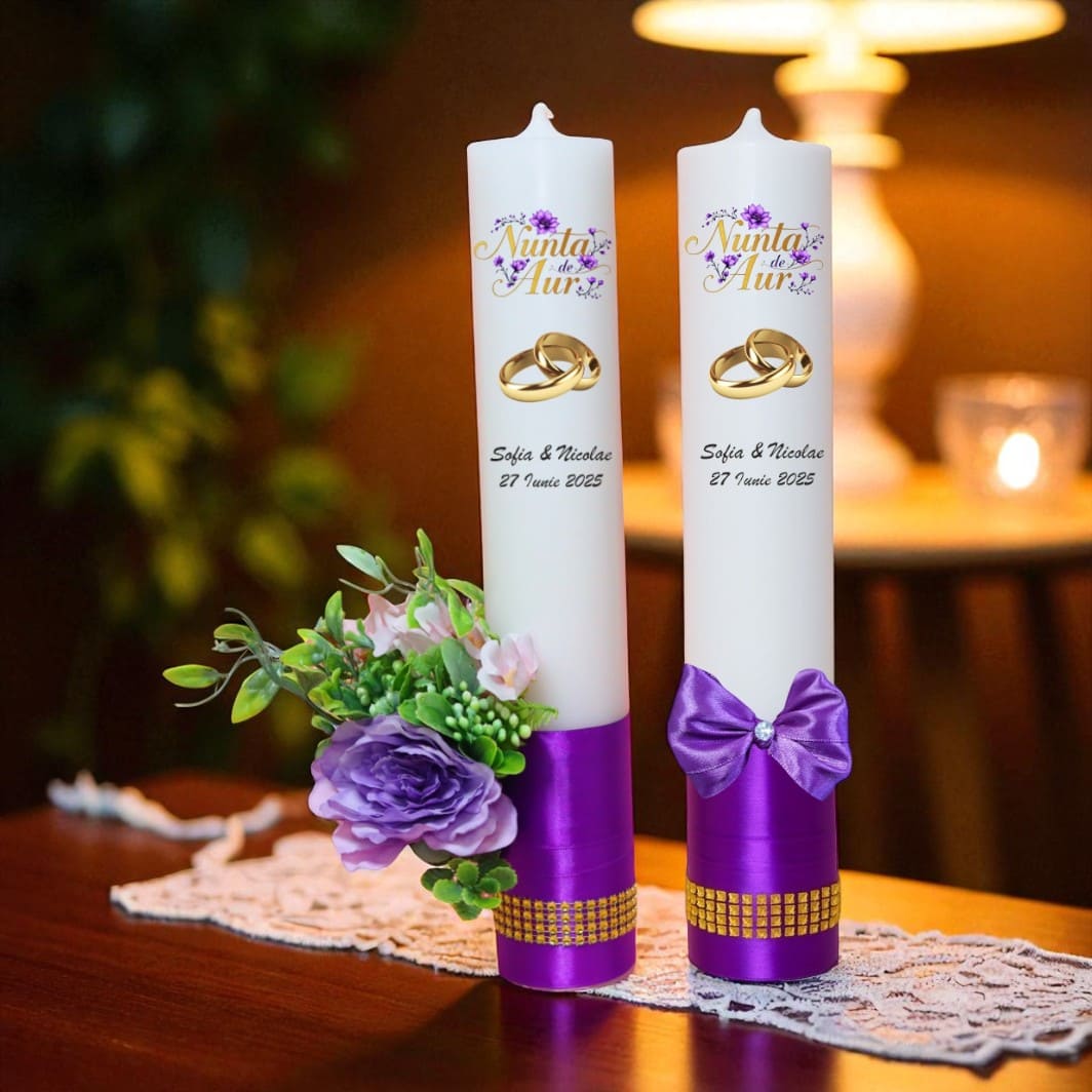 Set Lumanari, Nunta de Aur, Personalizate, 2 Bucati, Mov, 35 cm, LNAU007
