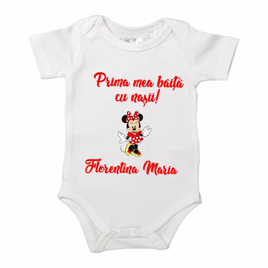 Body din 100% bumbac, personalizat cu nume si mesajul ”Prima mea baita cu nasii!”.