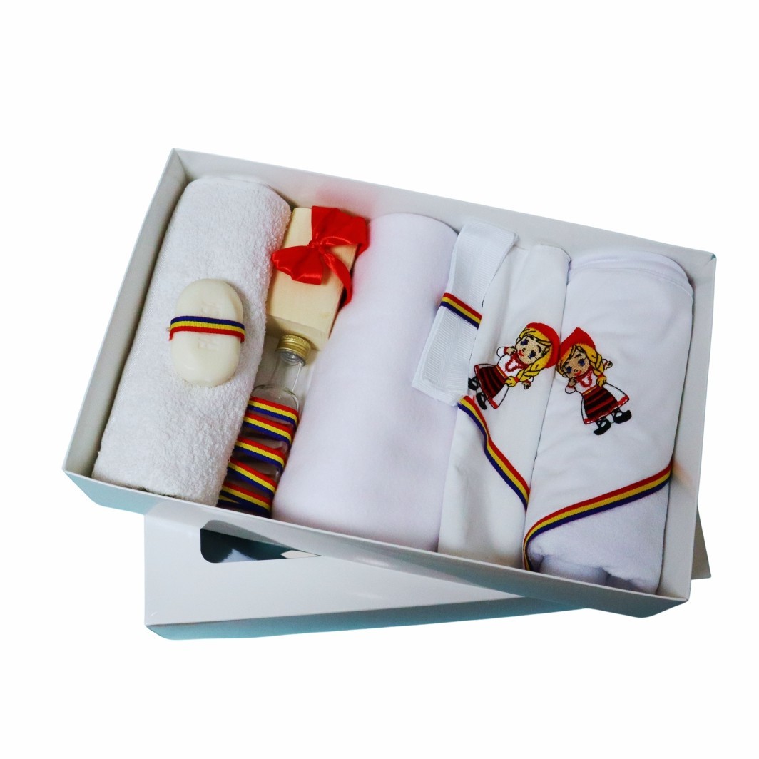 Trusoul brodat cu tematica Traditionala si panglica tricolora, contine tot ce este necesar la biserica, pentru botez si vine ambalat intr-o cutie de cadou.